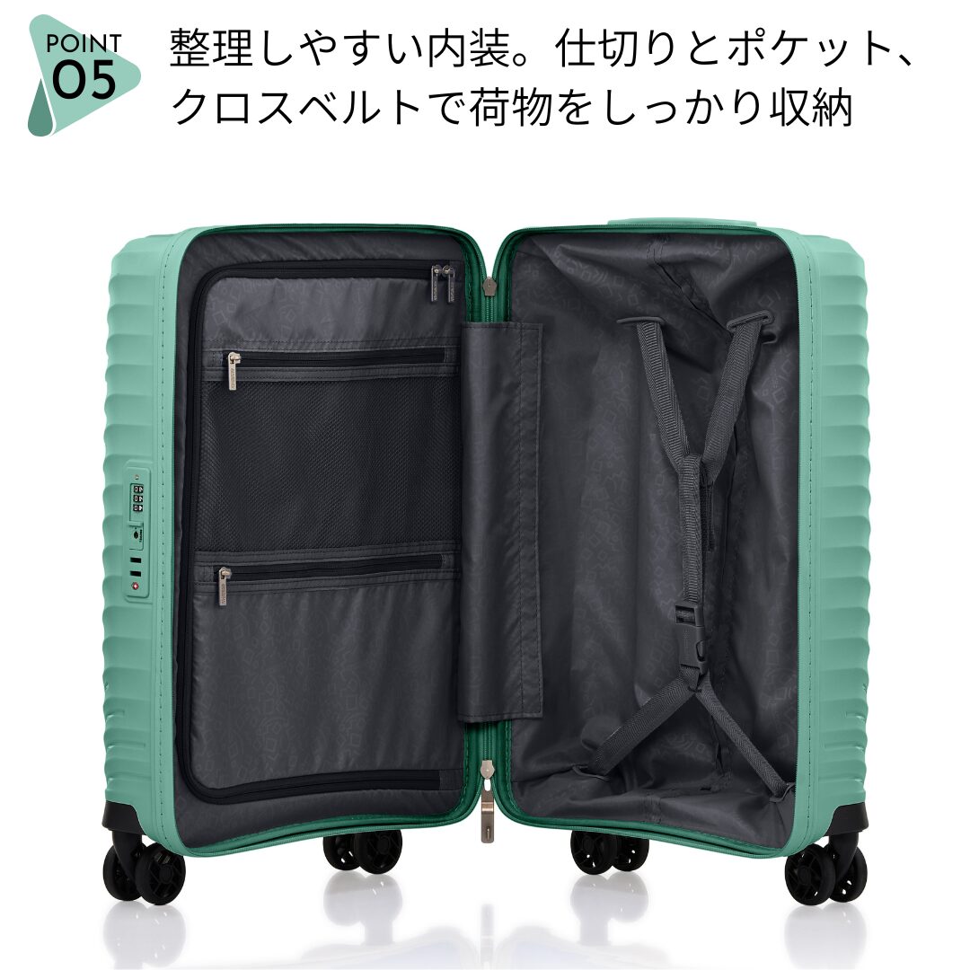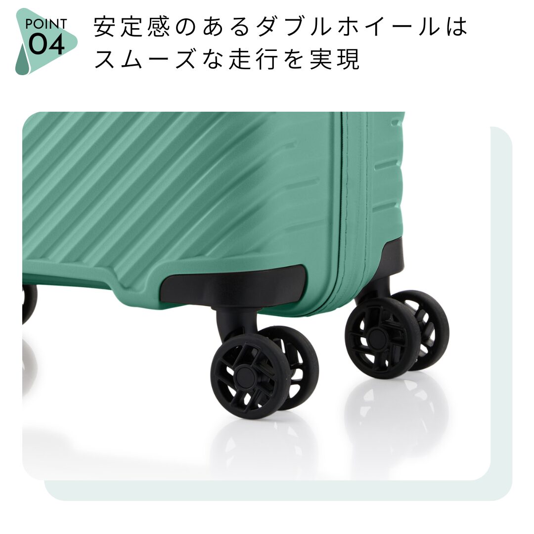 安定感のあるダブルホイールはスムーズな走行を実現。内装は整理しやすいレイアウトで、左側には荷物がこぼれ落ちないファスナー仕切りを装備。仕切り部分には視認性に優れたメッシュポケットと、小物収納に便利なファスナーポケットを2つ備えています。右側には荷物をしっかり固定できるクロスベルトを備え、移動中も安心です。