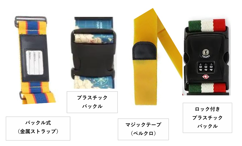 スーツケースベルトには、いろいろな留め方(脱着方式)やロックの仕組みがあります。